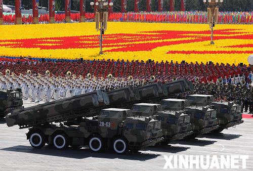 10月1日,首都各界庆祝中华人民共和国成立60周年大会在北京天安门广场举行。这是来自第二炮兵的陆基巡航导弹方队通过天安门广场。新华社记者郭大岳摄