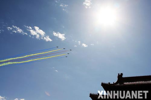 10月1日,首都各界庆祝中华人民共和国成立60周年大会在北京天安门广场举行。这是教练机梯队在天安门上空拉出道道彩色烟带,为气势磅礴的国庆60周年阅兵划上圆满句号。新华社记者刘宇摄