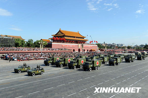 10月1日,首都各界庆祝中华人民共和国成立60周年大会在北京举行。这是后勤装备方队接受检阅。新华社记者陈树根摄
