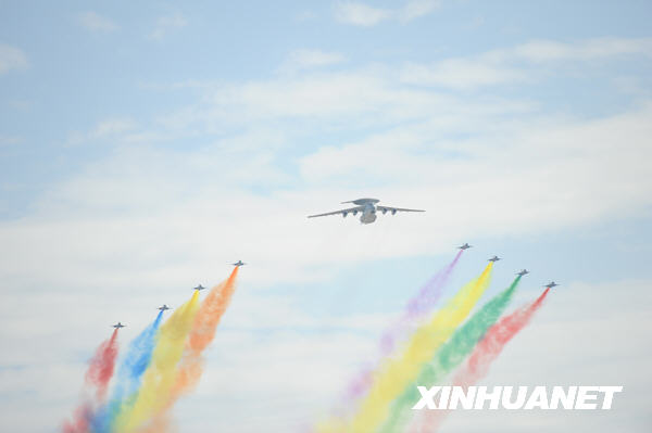 10月1日,首都各界庆祝中华人民共和国成立60周年大会在北京举行。这是多机编队的领队梯队。新华社记者李尕摄