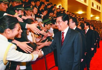 人民大会堂宴会厅里气氛热烈。下午4时许,当胡锦涛等中央领导同志来到这里,全场掌声雷动。胡锦涛等高兴地同大家热情握手,并合影留念。