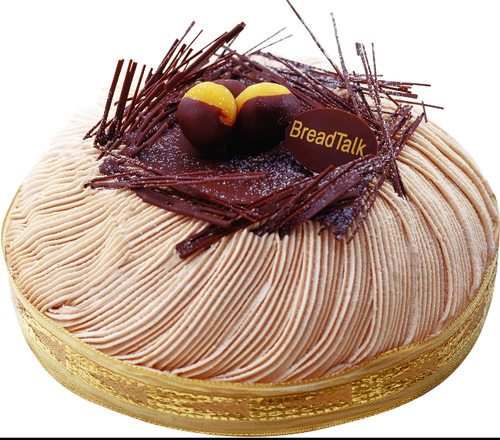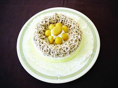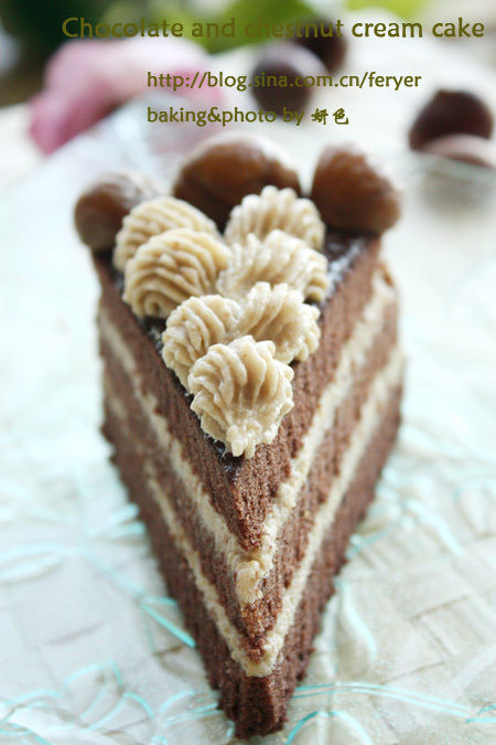 把栗子和巧克力混匀,在奶油蛋糕中间夹上厚厚的一层,做成可爱的蛋糕。在混合栗子和巧克力时,放入少许白兰地Cognac是调出好味道的秘诀。最后,别忘了在做好的蛋糕上撒上充足的巧克力粉。