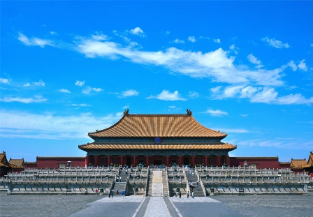 帝王的办公区在前,主要有皇帝举行重大典礼、召见文武官员的三座大殿,它们由南向北排列在中轴线上的工字形台基上,用最高贵的建筑规格体现着皇权的尊贵。