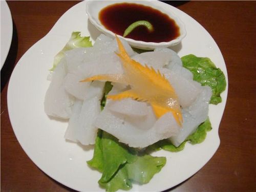 值得一提的是一盘蒟篛。服务员说了三遍,我都没听清楚,只得请她写下来。我是第一次看见这两个字,服务员告诉我这就是魔芋。魔芋是多年生草本植物,而放在我眼前的分明是鱿鱼卷一样的荤菜。同样的细碟里有调味酱,不同的是,酱中多了一小匙绿色芥末。吃的感觉就像鱿鱼卷一般有韧劲,加上芥末和酱,于清淡的素餐中欲罢不能,再要一盘,忘却其原本是出世之品,于是吃出了一番大气象,最后于泪水汹涌处,五脏六腑有了一番大通透。莫非禅宗的顿悟即在于此?