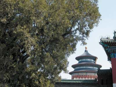 在北京故都,能从树木和建筑中同样感受皇家神圣庄肃精神的首选之处,应该是天坛了。天坛位于北京城南,宣武区的地域,与故宫近在咫尺。到天坛看祈年殿、皇穹宇和圜丘,华美的建筑自有一派辉煌庄肃,这是我领略到的人间第一的皇家煊赫气象。但人们往往总是忽略了天坛周围的苍苍翠柏。在我看来,作为世界自然文化遗产的天坛,古柏林是一个重要的背景,没有古柏,天坛是荒凉的,削弱了生命的气息,更缺少了许多神圣的韵味。