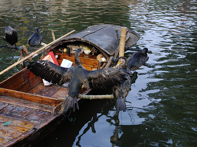 船夫告诉白山,白天打鱼时他们会把鱼鹰们带上,打完鱼就把它们往架子上一拴,方便得很。鱼鹰的脖子被勒住,只能吃小鱼,大鱼吞不下,因而可用于捕鱼(这白山是知道的)。白山不知道的是这玩意儿特别腥,遭人厌恶,不像人类豢养的其他牲畜走兽,在工作之余还能与人之间结下深厚或者不深厚的感情。人一面利用鱼鹰一面又非常地讨厌它,甚至都不吃它的肉。一只鱼鹰的寿命大约二十来年,二十岁左右就是没死也不能抓鱼了。因为肉腥所以也不能吃,就这么挖一个坑将它埋了。也有人不信邪,吃了鱼鹰肉,结果恶心得上吐下泻,多少天都缓不过来。而且身上的腥味儿经久不散,别人一闻就知道你吃了鱼鹰肉了,由于厌恶大家都躲得远远的。