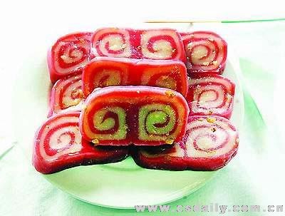 1.将豆沙,白糖200克,镶粉(粳米、糯米粉)500克,拌和成豆沙馅心。