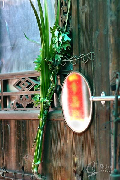 艾草代表招百福,是一种可以治病的药草,插在门口,可使身体健康。在 我国古代就一直是药用植物,针灸里面的灸法,就是用艾草作为主要成分 ,放在穴道上进行灼烧来治病。有关艾草可以驱邪的传说已经流传很久,主要是它具备医药的功能而来,像宗懔的《荆楚岁时记》中记载曰“鸡未鸣时,采艾似人形者,揽而取之,收以灸病,甚验。是日采艾为人形,悬于户上,可禳毒气。”一般人也有在房屋前后栽种艾草,求吉祥的习俗。台湾民间也有在端午时贴“午时联”,它的作用和灵符一样,有些午时联上有下列的句子“手执艾旗招百福,门悬蒲剑斩千邪”。 榕枝在民间的意义可使身体矫健“插榕较勇龙,插艾较勇健”。也有地方习俗是挂石榴、胡蒜或山丹,胡蒜除邪治虫毒;山丹方剂治癫狂,榴花悬门避黄巢, 石榴花正是这个季节的花卉,也有治病的功能。石榴皮为一常见的中药。而石榴花和黄巢的关系,还有一段故事。黄巢之乱的时候,有一次黄巢经过逼个村落,正好看到一个妇女背上背着一个较大的孩子,手上牵着一个年纪较小的,黄巢非常好奇,就询问原因。那位妇人不认识黄巢,所以就直接说因为黄巢来了,杀了叔叔全家,只剩下这个惟一的命脉,所以万一无法兼顾的时候,只好牺牲自己的骨肉,保全叔叔的骨肉。黄巢听了大受感动,并且告诉妇人只要门上悬挂石榴花,就可以避黄巢之祸。