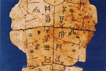 殷人自公元前十四世纪迁居于河南安阳一带。他们笃信鬼神,事无大小都要占卜吉凶。他们用龟甲或兽骨占卜,并将问卜与吉凶刻在这些甲骨上,这些文字即现称之甲骨文。甲骨文是光绪二十五年之后才陆续为人所注意的。它的特色在于笔划多方折挺拔,具有刀锋的味道,是经由写过再用刀刻的缘故,而这种方折挺拔的行笔便是殷代书法的风貌了。