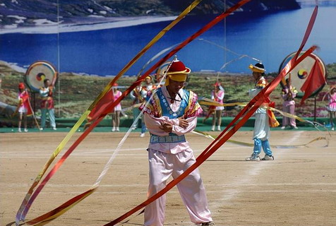 为"农乐舞"最后压阵的男子"象帽舞",是向来令人瞩目和兴奋激动的舞蹈。一个个身着节日彩服、头戴盘有彩带圆帽的男青年,先后表演处于站立、行走和支、转于地面姿态下,用头部将蚀?Τ鏊?健⒋怪薄⑶阈狈轿坏脑不 8?屑家崭叱?咧蒙沓〉刂醒耄?硌葑潘Χ?ご?0米彩带的高难技巧。顿时,满目的若干彩带,似万道霓虹横空出世,若千条丝雨旋落碧空,令人目不暇接、浮想联翩。