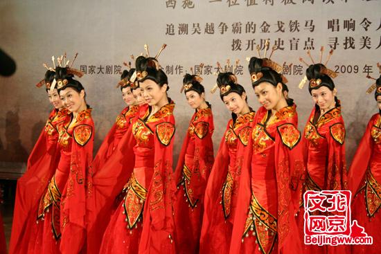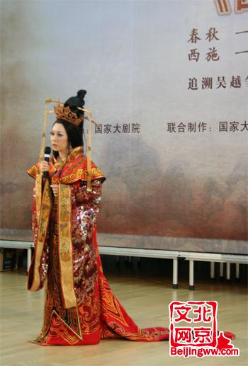 此前,身为国际“飞”人的主演张立萍一直未曾与媒体谋面,今天,这位被誉为“世界歌剧舞台最美蝴蝶夫人”的著名歌唱家终于出现在记者面前。她的出场也格外引人注目,一袭红色的华服正是西施入吴宫后的造型,精致细腻的纯黑色刺绣源于青铜器铭文花样,让张立萍版的“西施”在妩媚、华美之余又不失大气。对于此次扮演西施,张立萍说:“曲调朗朗上口,却一点都不俗气。那调子就像飘在很高的地方,给人无法言说的感觉,非常感人。”张立萍坦言,当初她一拿到《西施》的谱本,哼着哼着就很快被其中的旋律带“进”了去。“这样的音乐能够把西方的美声唱法和中国女性的柔美完美结合起来。”