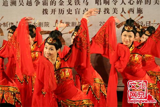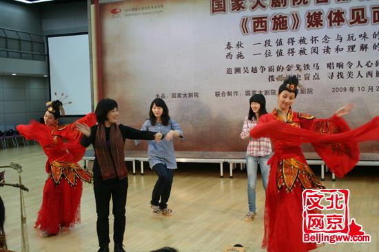 该剧的舞蹈设计肖艳英介绍,“《西施》不但是一部需要用心聆听的歌剧,也是一部绝对好看的歌剧。刚刚给记者朋友看的就是一段非常有特色的响屐舞,据传是由西施发明的。我们根据史书上的记载,再加上剧情发展,编了这段舞蹈。舞蹈抓住古典的审美观,充分体现中国古典舞‘拧、曲、倾’的动作特点。”对于记者非常好奇的“响屐”,肖艳英说:“这种能踩出悦耳节奏的舞鞋与木屐有几分相似,鞋底由四公分厚的轻质柳木特制而成,用皮带从脚面一直绑到小腿,鞋面上则缀满铃铛。舞蹈时,木屐以铃声为佐,踩着节奏,与服装上的铃铛交相呼应。”在编舞肖燕英的指导与演员的示范下,两位特邀而来的大剧院会员也穿上了舞屐,学着跳起了“响屐舞”,虽然在短短的时间里只学到了皮毛,但也有模有样。