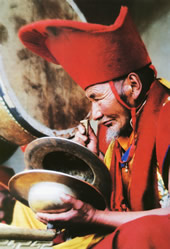 第三个部分是焚化“朵玛”。正如前面所述,“朵玛”是具有无比降魔除障威力的施食,经过长达一个多月的供养和诵经念咒,得到被称为“噶结”的宁玛派八位本尊神的威光加持,这尊“朵玛”可以称为“噶结朵玛”。神舞结束时,将“棱噶”放置装“朵玛”的大铜盘内,喇嘛们抬着“朵玛”,神舞表演者紧紧跟随,在一个最为吉祥佳胜处,“朵玛”被搁置在麦草堆成的屋子里,由“恙本”(金刚神舞之头领)念咒作法,众僧洒油点火加以焚化。直贡地区官员罗结先生告诉我,由于“林洛”战乱,直贡派和萨迦派结怨很深,这种焚化“朵玛”的猛法往往针对萨迦寺进行,称为“梯萨朵”,意为直贡梯与萨迦寺抗争之举。当直贡梯焚化“朵玛”之时,萨迦寺将有一个总管受到伤害,而萨迦寺焚化“朵玛”之时,直贡梯的巨型铜锅也会突然倒扣。不过这些都是历史故事了。