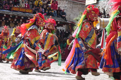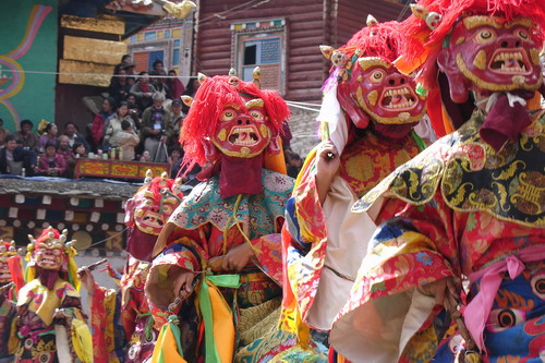 近年来,我又不止一次到过直贡峡谷。看见经过文化革命劫难的直贡梯、扎雪、亚日岗等寺院均已逐步修复,喇嘛们正在进行宗教修习,各项法事活动也在按传统惯例进行。“切仓”活佛察绒·丹增曲杰现在拉达克直贡噶举派寺院主持教务,“琼仓”活佛拉加日·曲吉朗旺是西藏自治区佛协理事。直贡寺庙群的金刚舞确实饮誉整个西藏。过去我听直贡寺奴巴·贡觉丹增活佛、格贵(执法僧)贡交益西·涅巴、顿珠(管理员),还有亚日岗寺彭冲朱古·丹达活佛作过介绍,近年来又看过直贡梯寺僧人表演的全过程,总算有了一点了解。