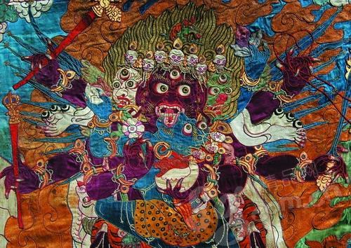 系藏语“卷轴画”的音译。最初可能是佛教徒随身携带的“行像”,后来成为藏传佛教室内供奉的主要形式。唐卡的制作方法有绘画、绎丝、堆绣等。绘画唐卡的布面处理和绘制技法,与布壁画相似。绎丝唐卡主要出于内地宫廷的制作,以通经断纬的技术织出图案形象;堆绣唐卡技艺独特,系依据构图需要将彩色绸缎剪裁后垫以羊毛或棉花绣于布幔之上,不论用何种方法制作的唐卡,最后都经过一道“装裱”手续,即在画心四周镶缝锦缎,上下再装天地杆,以便使用时张挂。