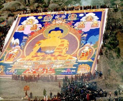 作为节日的序幕,哲蚌寺展佛是最令人瞩目的仪式。早上8点钟,哲蚌寺背后的半山腰上,在第一缕曙光的辉映下,伴着凝重、庄严的法号声,一幅500平方米的、用五彩丝绸织就的巨大释迦牟尼像徐徐展露出祥和的容颜……数万名信徒和深受感染的游客无不双手合十,顶礼膜拜。