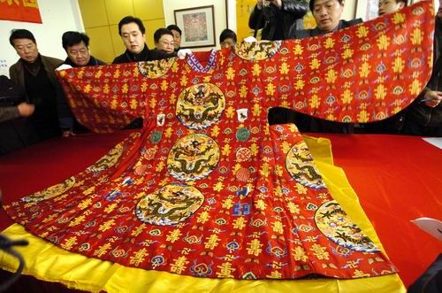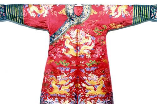 在中国传统戏剧的舞台上,凡有帝王将相、王妃公主出场,他们身上光彩夺目的服饰,总会让人们的眼睛为之一亮。它们有力地烘托了人物,渲染了剧情气氛。这些雍容华贵的戏剧服饰,是以明清帝王后妃和高官贵妇及千金们的服饰为蓝本,经过艺术加工制成的。而这些古代帝王们的服饰,其中许多就是用南京云锦缝制而成的。所以在“南京云锦”的制成品上也就打上了深深的“阶级烙印”。帝王服饰体现了“王权神授”的观念。历代帝王自命“真龙天子”,受命于天,驾临人世,统治众生,于是在服饰上大量使用传说中的神兽“龙”的形象,非帝王不准用,以示君临天下,唯我独尊。