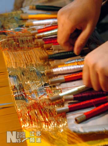 南京云锦是用长五点六米,宽一点四米,高四米的传统大花楼木织机,由拽花工和织手两人相互配合手工操作织造出来的。织机由一九二四个机件组成,“拽花