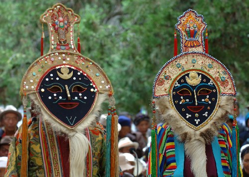 一是“温巴顿”,意为猎人净地,就是身着猎人装束手持彩箭首先出场,净场地,高歌祝福。其次是“加鲁钦批”,即太子降福。就是着太子装束者登场,象征加持舞台,给观众带来福泽。最后是“拉姆堆嘎”,即仙女歌舞。就是着仙女装者慢慢起舞,表示仙女下凡,与人间共享欢乐。这就是藏戏开场的序幕。