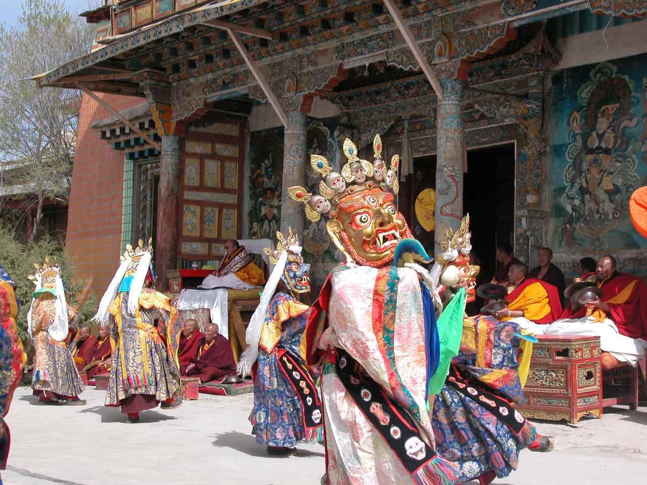 宗教仪式和宗教艺术。藏史《巴协》中记载;“八世纪时吐蕃赞普赤松德赞修建桑耶寺时,莲花生大师为调伏恶鬼所行轨仪中率先应用一种舞蹈”。这种舞蹈就是藏传佛教寺院跳神“多吉嘎羌姆”(金刚舞,简称羌姆)的起源。羌姆是在原始苯教巫师祭祀自然神仪式的基础上,吸收民间土风舞演变而来的新的宗教仪式舞蹈。开始羌姆完全是在寺院里为僧人表演,后来传入民间,僧俗人众均可观看,逐渐成为僧人和俗人群众喜闻乐见的一种具有一定娱乐性的宗教舞蹈。此外,在林芝还有一种与寺院完全无关的“米那羌姆”(俗人跳神),是为引回“村宝”进行驱邪迎祥而创立的民间祭祀舞蹈。其中象征喜庆、幸运和吉祥的男性侍佣神跳的“波梗舞”,也被寺院跳神萨迦寺卓玛颇章“孜玛尔多加”羌姆和藏剧《白玛文巴》所吸收。