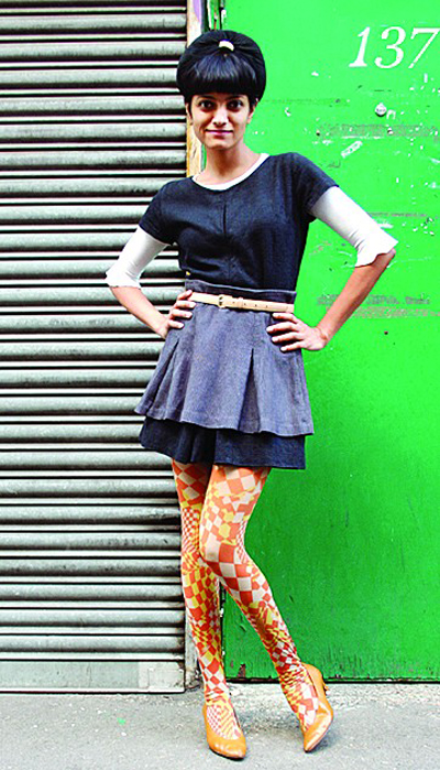 昨日下午,水妖到她的网站上去逛了一圈。页面右侧显示更新到2009年9月14日,第137天。页面正中是昨日最新搭配:黑裙子里穿了件白T恤,外面配了条小灰短裙,搭配的是色彩鲜艳的橙色方格彩袜。