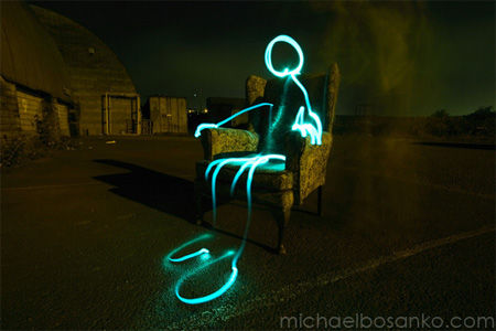 光学涂鸦跟写字是不一样的,因为要用光写字,所以一定要倒转过来写,类似于木版雕刻。对于不懂绘画的人来说,要反复试验,才能使线条完整流畅。另外,如果是普通的数码相机最好将曝光时间设置在6秒以上。在光线黯淡的地方作画时,诀窍是将感光度调整到最低,让曝光时间延到最长,这样的影像效果出来会有层次感和趣味性。