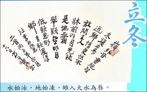 “立冬”节气在每年的11月7日或8日,我国古时民间习惯以立冬为冬季的开始,《月令七十二候集解》说:“立,建始也”,又说:“冬,终也,万物收藏也。”其实,我国幅员广大,除全年无冬的华南沿海和长冬无夏的青藏高原地区外,各地的冬季并不都是与立冬日同时开始的。按气候学划分四季标准,以下半年候平均气温降到10℃以下为冬季,则“立冬为冬日始”的说法与黄淮地区的气候规律基本吻合。我国最北部的漠河及大兴安岭以北地区,9月上旬就早已进入冬季,首都北京于10月下旬也已一派冬天的景象,而长江流域的冬季要到“小雪”节气前后才真正开始。