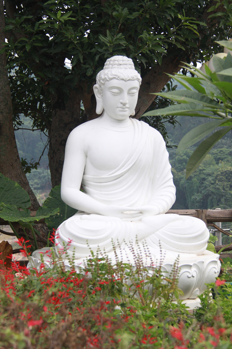 仿健陀罗风格的佛陀在湖边的香花丛中
