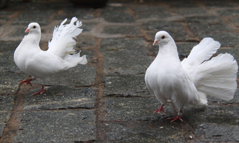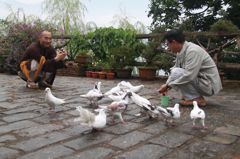 次日八点,镇慧法师、悟智法师、慈念法师带着我又来到了这里,弥补晚上未能看到的美景及香草园。这天,莆田下起了久违的小雨,霏霏的,有山水的景色自然是最美的。吴先生养了一群鸽子,这些鸽子是我见过最干净的,或许是它们生长在水边的缘故,更或许是有这么一个诗意的主人的缘故。吴先生一一唤着它们的名字,它们纷飞下来,围着他吃早餐。鸽子中有两只孔雀鸽,煞是美丽。