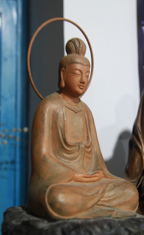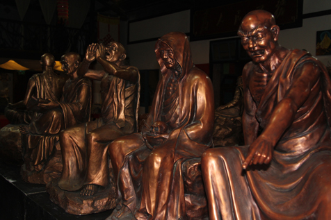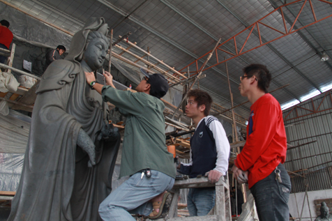我于公元1980年开始在大陆旅行。那时大陆刚刚改革开放,非常贫穷、落后。火车是烧煤的,过山洞时脸都黑了一半;汽车上面都有天然气袋。南到广州,北到哈尔滨,东到福建沿海,西到新疆的喀什噶尔、西藏的江孜。一直到2000年参加首届中国雕塑论坛(惠安),方文桃先生邀请我到莆田考察雕塑工艺发展。就在那年去的广化寺、南少林、湄洲妈祖庙。后来我觉得这里的人才资源很丰富,因为有国营工艺一厂(木雕),工艺二厂(竹编)。我是一个很懒的人,觉得这还不错就住下来了。方文桃先生介绍铸铜厂的李先生给我认识,李先生原来是冶金铸造工程师,后来自己办厂。我刚来时泥塑跟方文桃先生合作,在他的工作室里有三到四年的时间。我们互相照顾,生活上方文桃先生照顾我;艺术部分互有专长。他的罗汉像雕得特别好,还有中国古典人物,如四大美女、林冲夜奔等。他有传统,也有送到鼓浪屿工艺美术学校读书。这个学校是福建工艺界的摇篮,师资很好,以前那些教授是很苦干的人,办学很严谨,大师级的都是从那里出来。我的强项是在佛菩萨的庄严性和背后佛教文化底蕴部分。04年开始我培训自己的学生、干部,就独立出来,我们现在还是最好的朋友。铸铜部分跟李先生合作一直到现在。