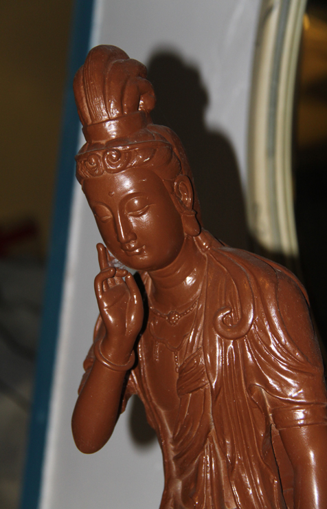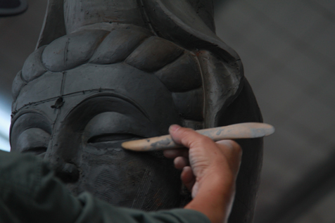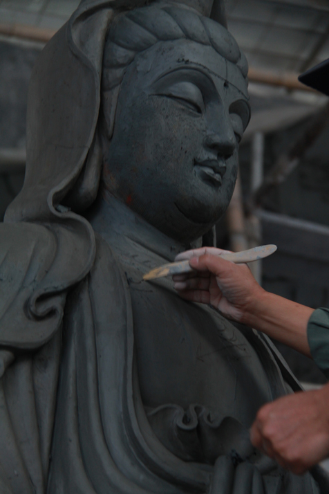12日上午九点三十,吴先生来广化寺接我去他位于涵江的工作室,参观了他的泥塑车间。在这里,我感受到了久违的艺术创作氛围:一边听音乐一边创作。他的学生们正在雕刻一尊观音像,墙壁那边的架子上,是很多的学生们在雕塑大型的墙面浮雕。不一会,吴先生爬上架子,亲手修改起观世音菩萨的雕像来,一边修一边给学生们讲解为何要如此修改的原因,甚至在观音菩萨的胸部用木雕刀边画边讲解——很有大学美术教师的风范。