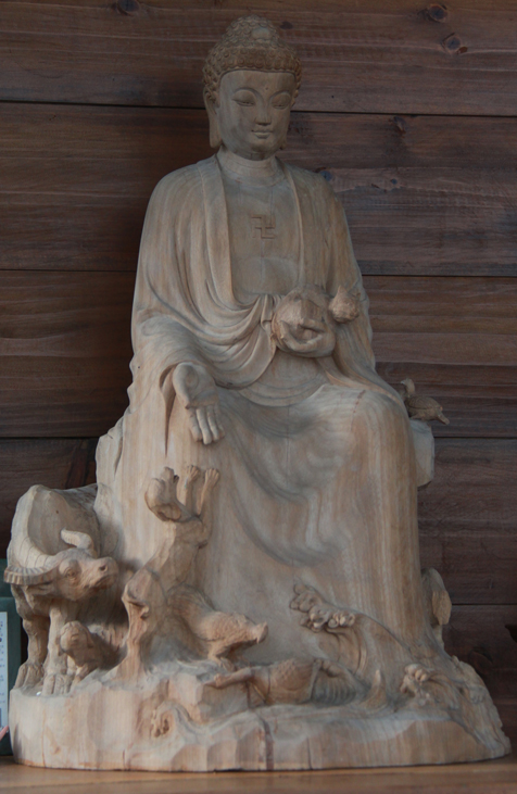 各种被人类宰食的动物环绕在佛陀身边,祈求庇护