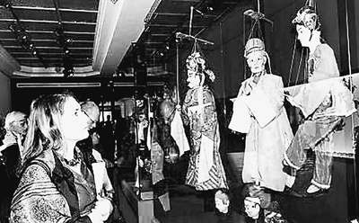 布鲁塞尔观众在福建泉州吊线木偶展出前驻足。
