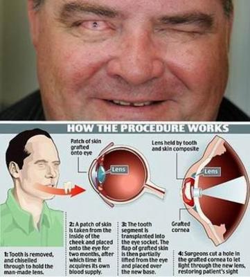 42岁的英国工人马汀-琼斯(Martin Jones)在一次液态铝爆炸中受伤,左眼不得不进行摘除。在当前接受的手术治疗中,医生将他的一段活齿拔出移植在眼眶中,人体口腔的犬齿形状正好嵌入眼眶,同时将人造眼球晶体放在犬齿中心凿出的一个小洞,再从琼斯口腔中提取一小块皮肤组织植入眼眶,确保眼睛的血液供给。手术结束两周之后,琼斯便恢复了视力。据他称虽然视觉有一种在水中看物体的感觉,但毕竟12年之后重新拥有视觉能力,进行基本的生活是没有问题的。这种牙齿移植眼球手术成功率为90%,术后患者可保持视力数十年。