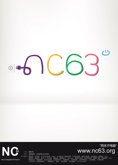 NC63是NO COMPUTER 63 HOURS的缩写,号召“从星期五下午6点下班到星期一早上9点上班之间,总共63个小时的周末时间,不使用电脑”。NC63旨在提醒白领一族适度使用电脑网络,减少因过度上网对健康、人际等多方面造成的负面影响。2009年的哥本哈根联合国气候变化大会将于12月初举行,届时各个国家都会对本国的二氧化碳减排量做出承诺。NC63的无电脑周末活动选择在09年11月底开始,并作为WWF世界自然基金的Vote Earth(选择地球)的系列活动之一,正是希望号召每个人通过周末关掉电脑的实际行动,支持低碳生活和绿色生活,支持环保公益事业,选择和支持地球。
