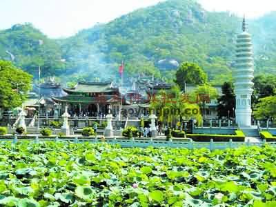 游览南普陀,还有一项“重要”内容不可忽略,那就是应该好好品尝这里独具特色的“素斋”。“我自舟山来,普陀又普陀。天然林壑好,深憾题名多。半月沉江底,千峰入眼窝。三杯通大道,五老意如何?”1962年1 1月24日,我国著名文学家、史学家郭沫若和夫人于立群,到此参观,饱餐之后,兴致勃勃,诗兴大发,而且十分巧妙地把“半月沉江”、“五老如意”两道菜名,融于诗中,从而也使它们身价大增,更为食客们所青睐。深受欢迎的传统佳肴“半月沉江”,主要是以当归、香菇、冬笋、面筋制作的汤,盛在蓝花瓷盆里,半边香菇,半边面筋,色泽分明,如同两牙新月,沉于江底,此时此地,此情此景,别有一番格调耐人寻味。这里的素菜,统统以植物为原料,象经常用的植物油、面粉、豆制品、金针、木耳、香菇、蘑菇、青菜、水果等,加以食醋、味精、五香粉、生姜、番茄酱等为配料,精心制作而成。花样繁多,口感清爽,鲜而不腻,余味无穷。