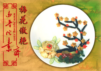 菜肴名称:梅花傲艳(冷盘)制作原料:素海参、素鲍鱼、猴头菇、香 菇、马蹄、南瓜