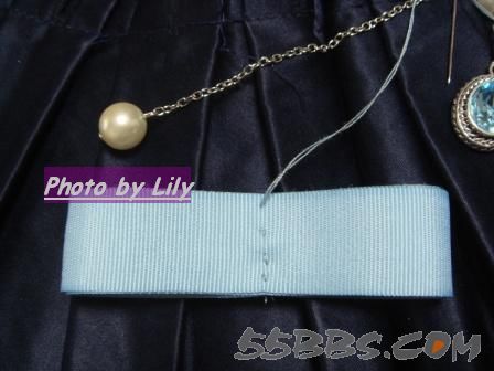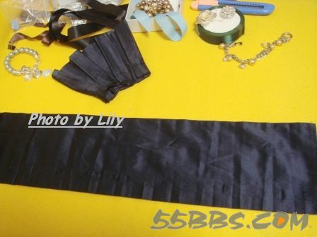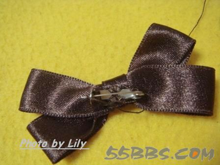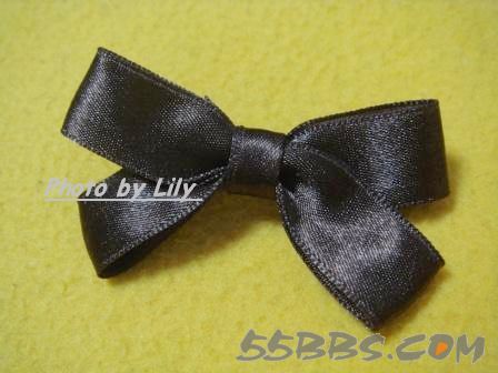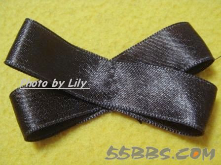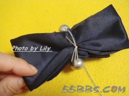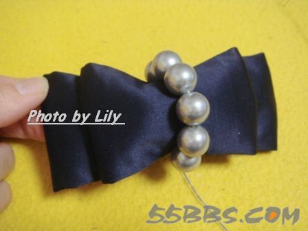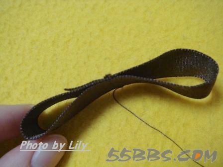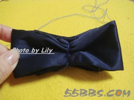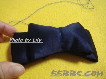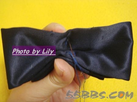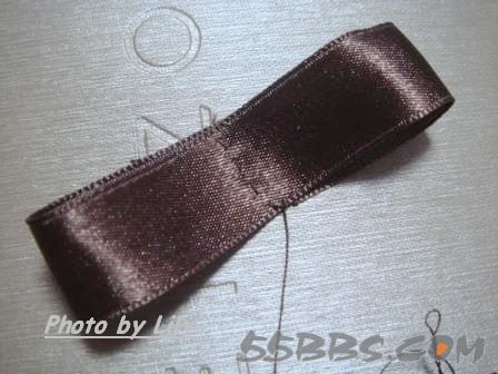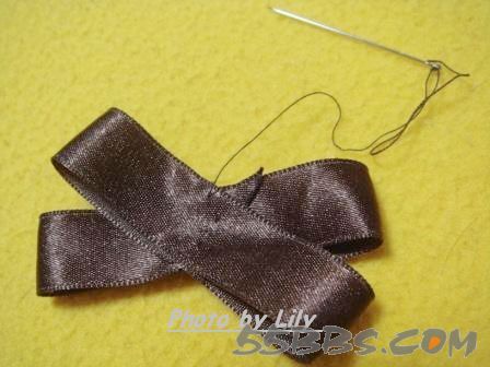 然后在中心点连接处封上一段丝带 ,缝得紧一点,顺便就吧蝴蝶结的立体感塑造出来啦!