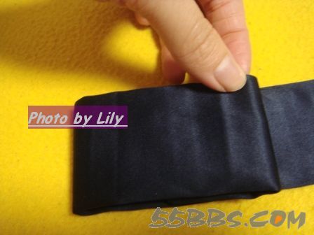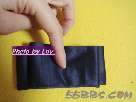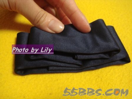 下面开始折叠蝴蝶结,注意始终不要露出缝线的那一面,我们一步步地看,就是从左滚到右的