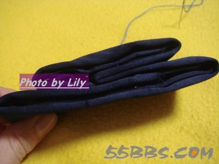 然后在我手指指的部位用针线固定,布料厚,要分几层耐心地缝牢固: