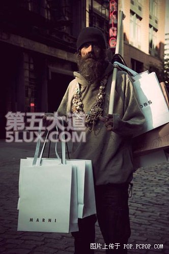 拎一大堆品牌的纸袋,一身潮装,谁说流浪汉不可以时尚?