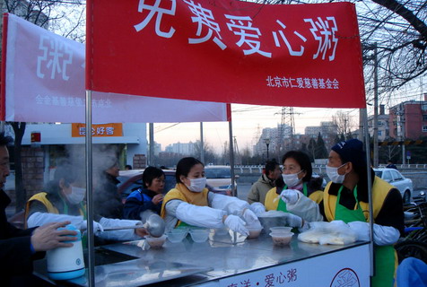 今有洛阳7、8位朋友,看样子像是城市群体,来北京下车第一次品尝到了、来自北京仁爱慈善基金会、红莲仁爱心栈志愿者们自制亲熬的爱心粥,都十分惊奇与欢喜、用着家乡的发音与用语连声说:“谢谢”“中中”“俺们也要把爱心来传递”而消失在晨色中。
