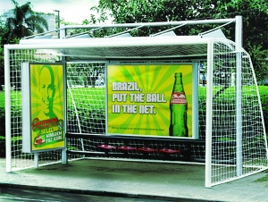 “独乐乐,与人同乐,孰乐?”在足球王国巴西,一家著名的啤酒公司为了推广产品,建造了这个足球球门的公交站,让那些等候公交车到来的市民和游客们,都能一同感受到足球的激情。