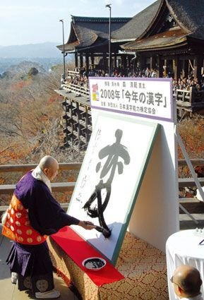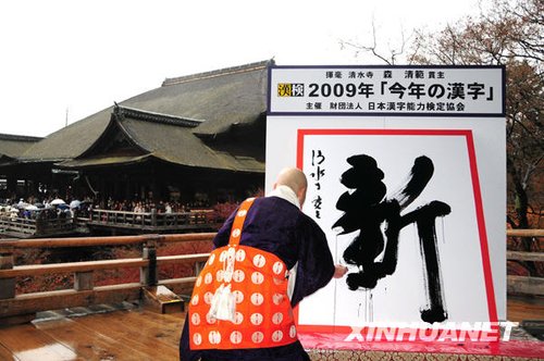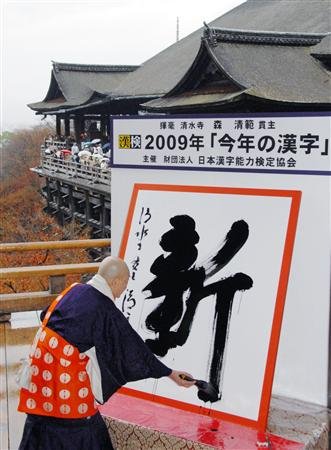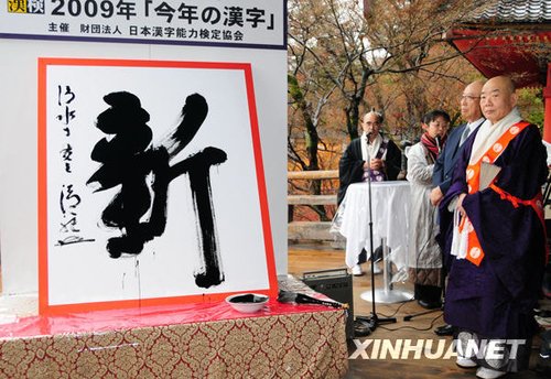 12月11日,日本京都清水寺住持森清范挥毫写下日本2009年年度汉字“新”字。