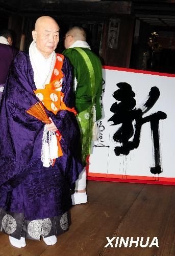 新华网日本京都12月11日电(记者 华义)11日下午,在京都的绵绵细雨中,清水寺住持森清范和往年一样,在一张约2平方米的白纸上挥毫写下大大的“新”字。继2008年的“变”字之后,“新”字成为代表日本今年世态的最贴切汉字。