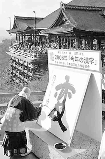 据日本汉字能力鉴定协会理事长鬼追明夫介绍,日本汉字能力鉴定协会从1995年开始每年年底举行年度汉字评选活动,去年,气候变化、日美关系变化以及全球金融领域的变化促成“变”字当选为2008年年度汉字。