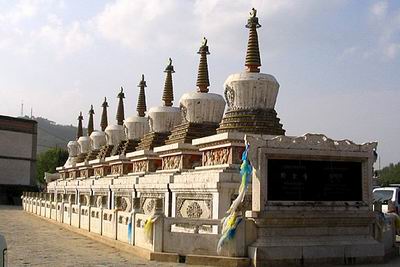 如来八塔 塔尔寺广场内矗立有整齐美观成一线的八座如来宝塔,以赞颂释迦牟尼一生八大功德。建于1776年(清乾隆41年)。这八个塔从东到西是:莲聚塔(纪念释迦牟尼降生时行走七步,步步开一朵莲花);菩提塔(纪念释迦牟尼修行成正觉);四谛塔(纪念释迦牟尼初转四谛法轮);神变塔(纪念释迦牟尼降伏外道时的种种奇迹);降凡塔(纪念释迦牟尼从天堂返回人间);息诤塔(纪念释迦牟尼劝息诸比丘的争端);胜利塔(纪念释迦牟尼战胜一切魔鬼);涅磐塔(纪念释迦牟尼入涅磐,不生不灭)。如来八塔每个塔底周长九点四米,底座面积五点七平方米。