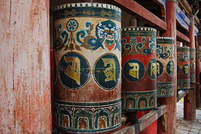 壁画是各殿宇墙壁上的绘画。大多绘于布幔上,也有直接绘于墙壁和栋梁上。壁画颜料采用石质矿物,色彩鲜艳,经久不变。壁画属喇嘛教宗教画系,与汉画有些不同,具有浓郁的印藏风味。壁画内容大多取材于佛经黄教诸密乘经典。画面情节属黄教内容,人物主次多属密乘教义。整幅画面构思巧妙,布置适然,色调和谐,精巧细腻,层次分明,千资百态,栩栩如生。