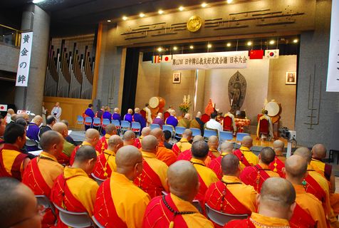 今天,来自日本、中国、韩国的佛教界人士,在立正佼成会横滨普门馆相聚一堂,举行第十二次日中韩三国佛教交流会议。并以此举行法会,共颂大乘佛典,祈愿世界和平。
