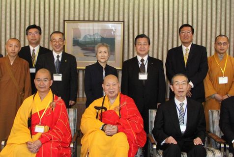 蒋副局长说:尊敬的庭野日鑛会长、立正佼成会的各位朋友。今天非常高兴能够随中国佛教代表团来到日本横滨,参加日中韩三国友好佛教交流会,在这之前能够拜见庭野日鑛会长,感到非常高兴。正如刚才我们学诚法师讲的,我们日本立正佼成会,跟我们中国佛教界,有着深厚的友谊,特别是庭野日鑛会长与我们赵朴老之间,有着非常深厚的友谊。庭野日鑛会长继承了老一辈这种优良的传统,把我们中日佛教友好交流发扬光大下去。庭野日鑛会长也是我们国家宗教局的老朋友,好朋友,我本人也非常有幸多次见到田野会长。特别是今年六月下旬,我们有机会在意大利世界宗教领袖峰会期间,见到了会长。经过这几年的交往,我有一个深切的感受,刚才我们学诚法师也谈到,日本立正佼成会,在我们日本是非常有活力、有生气的佛教教团,不仅在全力发展中日佛教的友好交流,同时也活跃在世界的佛教的舞台上,为了中日两国关系的友好,为了促进世界的和平,作出了积极的贡献。对此,本人也表示崇高的敬意和感谢!我也到过贵会设在东京和京都的普门馆,这次到了横滨的普门馆,对日本立正佼成会有了进一步的认识。